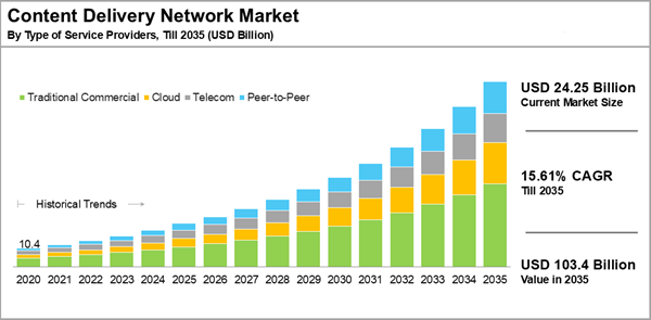 The global content delivery network market size is estimated to grow from USD 24.25 billion in 2025, to USD 103.4 billion by 2035, at a CAGR of 15.61% during the forecast period, till 2035.