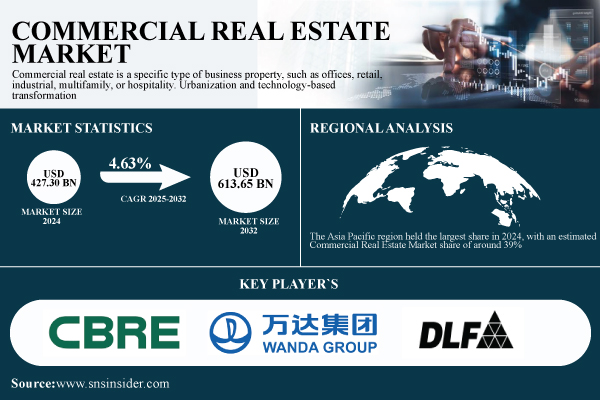 Austin, Nov. 21, 2025 (GLOBE NEWSWIRE) -- The Commercial Real Estate Market Size was valued at USD 427.30 billion in 2024 and is expected to reach USD 613.65 billion by 2032 and grow at a CAGR of 4.63% over 2025-2032.