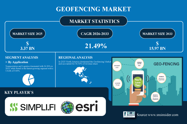 Austin, Nov. 27, 2025 (GLOBE NEWSWIRE) -- The Geofencing Market size is valued at USD 3.37 Billion in 2025E and is projected to reach USD 15.97 Billion by 2033, growing at a CAGR of 21.49% during 2026-2033.