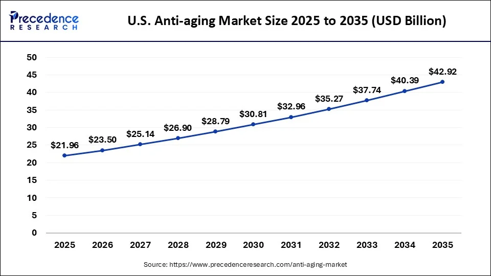 According to Precedence Research, the U.S. anti-aging market size is valued at USD 21.96 billion in 2025 and is predicted to rise from USD 23.50 billion in 2026 to USD 42.92 billion by 2035, with a strong CAGR of 6.93% from 2026 to 2035.