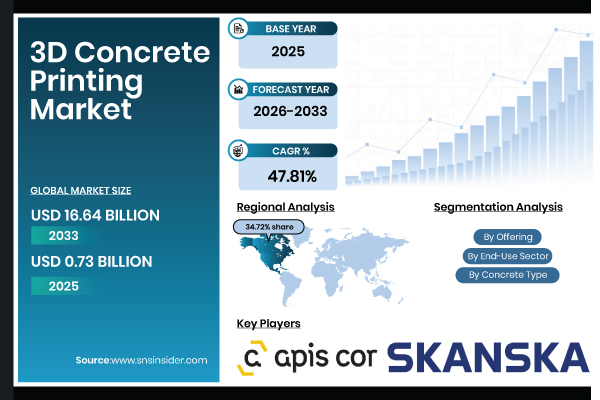 Austin, Dec. 12, 2025 (GLOBE NEWSWIRE) -- According to SNS Insider, The 3D Concrete Printing Market Size is estimated at USD 0.73 Billion in 2025 and is projected to reach USD 16.64 Billion by 2033, growing at a CAGR of 47.81% during 2026–2033. According to the analysis of the 3D concrete printing market, the market is expected to increase as a result of growing investments in smart cities, growing use in residential, commercial, and infrastructure projects, and rising need for quick and sustainable building solutions.