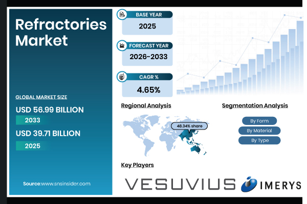 Austin, Dec. 17, 2025 (GLOBE NEWSWIRE) -- According to SNS Insider, The Refractories Market Size is estimated at USD 39.71 Billion in 2025 and is expected to reach USD 56.99 Billion by 2033, growing at a CAGR of 4.65% during 2026–2033. The market is driven by the high demand from steel, cement, glass, and non-ferrous industries.