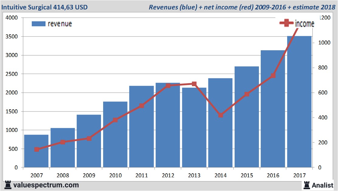 Tomorrow the American Intuitive Surgical will report its past quarter's results. Over the current book year the total revenue will be 3,52 billion USD (consensus estimates). This is rather significant more than 2016's revenue of 3,13 billion USD.