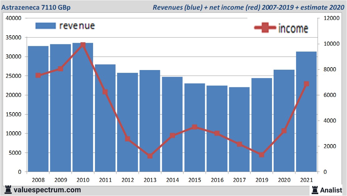 Astrazeneca The analysts expect for 2021 a net profit of 6.83 billion GBp. The majority of the analysts expects for this year a profit per share of 507 GBp. So the price/earnings-ratio equals 13.52.