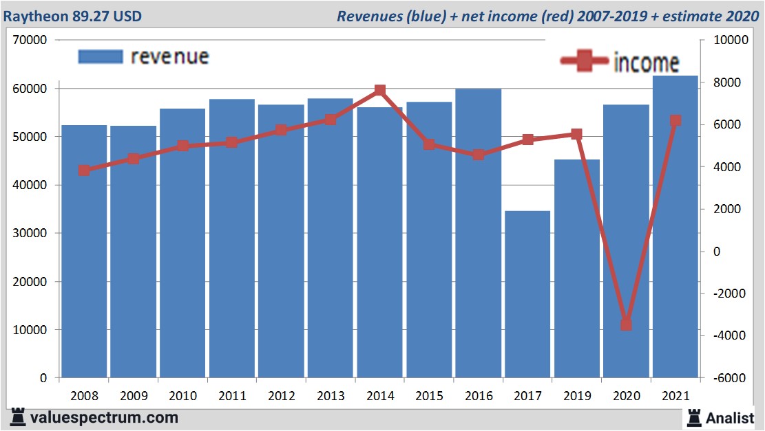 For this year Raytheon 's revenue will be around 65.19 billion USD. This is according to the average of the analysts' estimates. This is rather significant more than 2021's revenue of 56.59 billion USD.