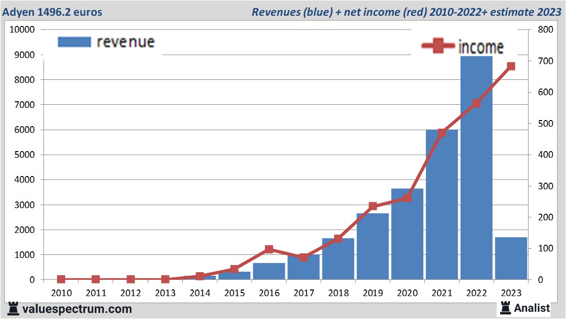 Tomorrow the Dutch Adyen will publish its past quarters figures. For this year Adyen 's revenue will be around 1.7 billion euros. This is according to the average of the analysts' estimates. This is quite lower than 2022's revenue of 8.94 billion euros.